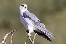 The black-winged kite (Elanus caeruleus), also known as the black-shouldered kite (not to be confused with the closely-related Australian species of the same name), is a small diurnal bird of prey in the family Accipitridae best known for its habit of hovering over open grasslands in the manner of the much smaller kestrels. This Palearctic and Afrotropical species was sometimes combined with the Australian black-shouldered kite (Elanus axillaris) and the white-tailed kite (Elanus leucurus) of North and South America which together form a superspecies. This kite is distinctive, with long wings; white, grey and black plumage; and owl-like forward-facing eyes with red irises. The owl-like behaviour is even more pronounced in the letter-winged kite (Elanus scriptus), a nocturnal relative in Australia. Although mainly seen on plains, they are sometimes seen on grassy slopes of hills in the higher elevation regions of Asia. They are not migratory, but show nomadism in response to weather and food availability. They are well adapted to utilize periodic upsurges in rodent populations and can raise multiple broods in a single year unlike most birds of prey. Populations in southern Europe have grown in response to human activities, particularly agriculture and livestock rearing. Now present in SouthWest France