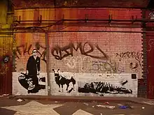 Initially influenced by the early graffiti-art of New York City after a visit in 1971, he chose a style which he felt better suited Paris, due to the differing architecture of the two cities.[4] He also recognised the influence of Canadian artist Richard Hambleton, who painted large-scale human figures in the 1980s.[3] In 1985, he was on the first meeting of the graffiti and urban art movement in Bondy (France), on the VLP's . Blek's oldest preserved street art graffito, a 1991 replica of Caravaggio's Madonna di Loreta, which he dedicated to his future wife Sybille, was rediscovered behind posters on a house wall in Leipzig, Germany, in 2012.[6]
