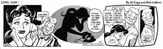 Lubber's own strips were Robin Malone (for NEA from 1967 through May 1970) and Long Sam, created by Al Capp and syndicated by United Feature Syndicate from 1954 to 1962. Although Long Sam was initially written by Capp, who soon turned the duties over to his brother, Elliot Caplin, Lubbers eventually assumed the writing duties himself in the strip's final phase. Long Sam was, like Li'l Abner, a hillbilly strip, though based on a female character. The title character, Sam, was a tall, voluptuous, naive mountain girl who had been raised in a hidden valley away from civilization by her Maw, who hates men and wishes to protect her daughter from them. The stories deal with Sam's inevitable discovery of the world and its discovery of her. Lubbers concluded Robin Malone in an ambiguous manner that left the survival of the protagonist unresolved.[5]