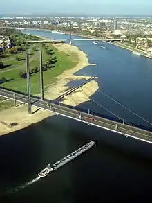 ![]() Aerial view of Düsseldorf-Oberkassel, looking East across the Rhine | |