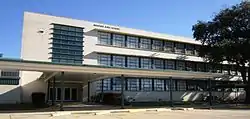 The present Bossier High School, a three-story building located at 777 Bearcat Drive, was built in 1938–39. It was listed on the National Register of Historic Places in 2004.[2] It was designed by architect Samuel Wiener in International Style. Due to rapid population growth, the city's Bossier High School (Colquitt Street) built in 1923 and 1928 became over-crowded, and this school was built to replace it. The former school was then devoted to serving elementary school levels. It was built by contractor James T. Taylor of Fort Worth, Texas. The listing included three contributing buildings.[5]