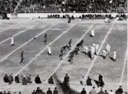 The 1940 season can arguably be called the greatest year in the history of Boston College football. BC's undefeated (11–0) and untied team, captured the 1941 Sugar Bowl championship and earned the nickname "Team of Destiny".[16][17] Five members of that storied team have been inducted into the National Football Foundation's College Football Hall of Fame: receiver Gene Goodreault (50); guard George Kerr (47); center Chet Gladchuk (45); fullback Mike Holovak (12); and halfback / quarterback Charlie O'Rourke (13). It included a 19–18 victory over No. 9 Georgetown before 41,700 fans at sold-out Fenway Park, that was called one of the greatest games ever by famed sportswriter Grantland Rice.[18] Going into the game, the Hoyas had 22 consecutive victories spanning three seasons. BC trailed until the third quarter, when a 43-yard touchdown pass from Charlie O'Rourke to Monk Maznicki put the Eagles ahead. With just seconds remaining, BC had the ball on their own nine, fourth down and 18 to go. Georgetown set up to return the Eagles' punt. Instead of punting, O'Rourke scrambled in his own end zone for 45 seconds then took a safety. BC used the free kick to boot the ball far downfield and dashed the Hoyas' three-season unbeaten record. Legendary Coach Frank Leahy, who would go on to cement his legendary status during an eleven-year stint as head coach at Notre Dame, took his undefeated Eagles on to the Sugar Bowl in New Orleans where they beat No. 4 Tennessee 19–13. Trailing 7–13 in the fourth quarter, Tennessee's Bob Foxx missed a short field goal attempt with three minutes remaining, and Boston College took over on its own 20–yard line. Quarterback Charlie O'Rourke led the Eagles on an eighty-yard drive, capped with his 24-yard touchdown run to seal the victory.[19] A banner on campus commemorating the team uses the phrase "national champions", but Boston College was not awarded a national championship by any of the national polls at the time of the 1940 season. Although BC's claim to a title is not recognized by the NCAA or college football historians in general, one website, the College Football Data Warehouse, claims that selectors named Cliff Morgan and Ray Bryne rated BC No. 1 in 1940.[20] This web site states that BC's historic 1940 run resulted in a split championship with the University of Minnesota, but it's not clear whether the selectors awarded BC a title at the time of the 1940 season, or if they did so retroactively.[21] The NCAA lists only Minnesota (who finished No. 1 the final AP Poll) as the national champion in 1940, and does not credit Boston College with any national championships in football.[22]