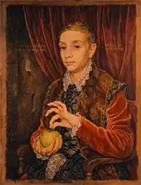 British artist Michael Taylor painted Boy with Apple in 2012 for use in the then-upcoming film The Grand Budapest Hotel. Taylor was contacted by director Wes Anderson, who requested a faux Renaissance-era portrait that would evoke imagery from European art history.[3] Anderson actively added his own input to the work; specifically, he asked that the painting be made along the lines of works by Hans Holbein the Younger and Elder, Bronzino, Lucas Cranach the Elder, and a number of Flemish and Dutch painters.[4][5]