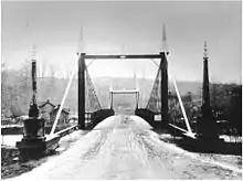 Until wagon bridges were built across the Little Miami River, settlement of Loveland was mostly confined to the Clermont County side, which had access to a railroad station.[3][4] A wooden bridge spanned the river at Symmestown and what would become Branch Hill from 1850 until it washed out six years later.[5] For years, residents on both sides pushed for a bridge at Loveland, to avoid the long trip to Foster's Crossing or Miamiville, and by 1868 threatened to have Miami Township annexed to Hamilton County if Clermont County officials continued to obstruct the project.[6] A $75,000 suspension bridge was finally built at Symmestown and Branch Hill and dedicated on July 4, 1871. It was anchored by four 7,000-pound (3,200 kg) wrought iron columns, at that time the heaviest ever made in the United States.[5]