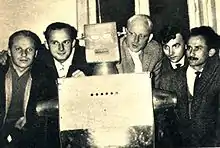 ![]() Cybernetics Group, 1962. Branimir Makanec is the first to the right of the robot. | |