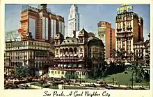 The new aesthetic also stimulated the remodeling of Rio's traditional leisure centers such as Casa Cavé and Confeitaria Colombo, still considered one of the ten most beautiful coffee houses in the world, as well as the flourishing of rhythms such as choro and samba.[27] Sophisticated hotels such as the Copacabana Palace Hotel, the Glória Hotel and the Balneário Hotel (which later became better known for housing the famous Urca Casino) were inaugurated for the Independence Centenary International Exposition.[28][29] On September 7, 1929, the Joseph Gire Building, the first skyscraper in Brazil, was inaugurated. As a result of all these transformations, in 1928 the journalist and writer from Maranhão, Coelho Neto, described the city in short stories as "A Cidade Maravilhosa" (English: The Marvelous City), a nickname that inspired the carnival march of the same name, composed in 1934 by Antônio André de Sá Filho.[30] In São Paulo, during the First Brazilian Republic (1889-1930), the city industrialized and the population increased from around 70,000 in 1890 to 240,000 in 1900 and 580,000 in 1920. The peak of the coffee period is represented by the construction of the second Luz Station (the current building) at the end of the 19th century and by the Paulista Avenue in 1900, where many mansions were built.[31][32]