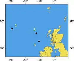 Having decided on a preferred method of disposal, Shell contracted Fisheries Research Services (FRS) to investigate possible sites for sinking the facility. There were two stipulations to this search: firstly, that the site was within the UK exclusive economic zone,[3]and secondly, that the site be deep enough that the sunken buoy would present no hazard to shipping. FRS identified three sites as 12 by 12 mi (20 by 20 km) squares, which were considered suitable; the Maury Channel, the North Feni Ridge and the Rockall Trough.
