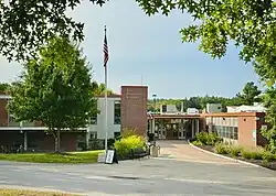 The new Bromfield School, as seen from the rear parking lot, is next to the Old Bromfield School (now the Harvard Public Library) seen on the right.