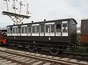 LNWR 182 6-wheel picnic saloon. Built in 1894. Later grounded, body is now on an ex-LMS underframe of the same length. Now restored and operational, although inside Quainton Road workshop as of 3 March 2019.