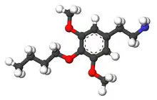 Buscaline (3,5-dimethoxy-4-butoxyphenethylamine) is a chemical compound prepared as a possible psychedelic drug. It is an analog of mescaline. Buscaline was first synthesized by Alexander Shulgin. In his book PiHKAL, the minimum dosage is listed as 150 mg, and the duration is "several hours".[1] Buscaline produces no psychedelic or psychoactive effects, but causes heart arrythmia and light diarrhea. It does not cause any visuals or insights.[1] Very little data exists about the pharmacological properties, metabolism, and toxicity of buscaline.