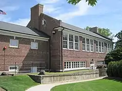 The schoolhouse is considered an example of Georgian Revival architecture with Federal Style details. The building is rectangular, with the long side running north to south, with a wing on the east and the west. The rectangular portion is 62 by 34 feet (19 by 10 m), the east wing is 28 by 18 feet (8.5 by 5.5 m), and the west wind is 18 by 18 feet (5.5 by 5.5 m), combining for approximately 6,000 square feet (560 m2). It is made of brick with wooden trim and windows. Like many Georgian Revival buildings, there are chimneys on opposite ends of the building. The chimneys both have a cement cap. A fanlight sits above the main door on the south facade; the doorway still has its original three-paneled wood doors. It opens to the vestibule, where a metal staircase leads to the second floor. Though the stairs have since been carpeted, the staircase maintains its original balustrade with matching newels. The north end of the vestibule as an elliptical fanlight. Windows are double hung and feature a brick lintel with a keystone.[1]