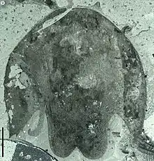 Cambroraster is an extinct monotypic genus of hurdiid radiodont, dating to the middle Cambrian, and represented by the single formally described species Cambroraster falcatus.[1] Hundreds of specimens were found in the Burgess Shale, and described in 2019.[2] A large animal (for its era) at up to 30 centimetres (12 in) (but not as long as Titanokorys at 50 centimetres (20 in)), it is characterized by a significantly enlarged horseshoe-shaped dorsal carapace (H-element), and presumably fed by sifting through the sediment with its well-developed tooth plates (oral cone) and short frontal appendages with hooked spines.[1] It is named partially after the fictional Millennium Falcon, which its dorsal carapace resembles.[1][3][4]