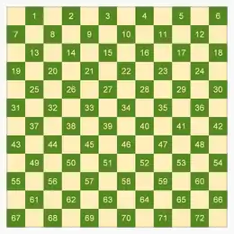 Canadian checkers follows the same rules and conventions as international draughts, the only differences are the larger gameboard (12×12 squares instead of 10×10), and more checkers per player (30 instead of 20). The starting setup is shown in the diagram.