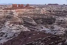 National parks in the Western US are more affected by climate change than the country as a whole,[51][52] and the National Park Service has begun research into how exactly this will effect the ecosystem of Canyonlands National Park and the surrounding areas and ways to protect the park for the future.[53] The mean annual temperature of Canyonlands National Park increased by 2.6 °F from 1916 to 2018.[54] It is predicted that if current warming trends continue, the average highs in the park during the summer will be over 100 °F by 2100.[55] In addition to warming, the region has begun to see more severe and frequent droughts[52][53] which causes native grass cover to decrease[56] and a lower flow of the Colorado River.[57] The flows of the Upper Colorado Basin have decreased by 300,000 acre-feet per year, which has led to a decreased amount of sediment carried by the river and rockier rapids which are more frequently impassable to rafters.[57] The area has also begun to see an earlier spring, which will lead to changes in the timing of leaves and flowers blooming and migrational patterns of wildlife that could lead to food shortages for the wildlife, as well as a longer fire season.[58]