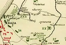 A second group of the retreating Gaza garrison had marched through the previous night, to gain distance and time to establish light field defences on a strong position just north of the Wadi el Hesi, seven miles (11 km) north north east of Gaza. In the sand dunes and in the cultivated area nearby, they constructed a series of short trenches. Behind these defences they resisted the EEF advance all day,[20][21][22][23] making a determined stand on the Wadi el Hesi.[24] It was towards this line held by the 7th Division, that the 53rd Division had withdrawn,[25] while the 3rd Division held Beit Hanun.[26]