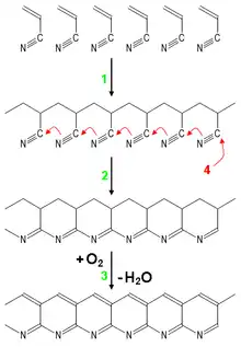 3. High-temperature oxidative treatment of carbonization (hydrogen is removed). After this process of graphitization starts where nitrogen is removed and chains are joined into graphite planes.