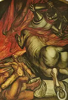 The former gaming room in the main hall came to be called the Salón de los Murales. The Spanish Republican artist Josep Renau painted a mural there of "La Hispanidad" a history of the Iberian Peninsula from the time of the Phoenicians to the conquest of America. The other side of the room held a 1965 mural by José Reyes Meza that depicted indigenous culture in the Valley of Mexico. The hall also had a mural of The Apocalypse by Jorge Flores, a disciple of David Alfaro Siqueiros.[11] Renau's Mural de la conformacion hispanica, painted with his wife Manuela Ballester(es), depicted the conquest and colonization of America by the Spanish and covered more than 300 square metres (3,200 sq ft).[16] The walls of the rooms and corridors also held the work of David Alfaro Siqueiros, Dr. Atl, Benito Messeguer, Jorge González Camarena, Francisco Icaza, Victor Moscoso and others.[17][18]
