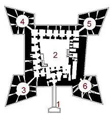 The castle of Barletta thus assumed its present morphological appearance: a quadrangular structure, with four pentagonal bastions at the corners, an endowment of cannons on all sides and a moat that allowed detachment from the mainland on three sides. On the other hand, the fourth side, to the north, faced the coast so as to ensure defense toward the sea. Access to the castle was mediated by a wooden drawbridge, built entirely during the 16th century.[53] However, the castle, renovated and adapted as a fortress, was never used for military purposes, due to the shift of interests from the Mediterranean basin to North and South America.[54][55]