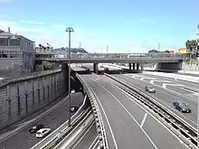 The Central Motorway Junction or CMJ (best known as Spaghetti Junction and rarely as Central Motorway Intersection[1]), is the intersection of State Highways 1 and 16, just south of the central business district of Auckland. A multilevel structure (three traffic levels crossing in several locations), it has been described as a "fiendishly complicated, multi-layered puzzle of concrete, steel and asphalt". Carrying around 200,000 vehicles a day, it is one of the busiest stretches of road in New Zealand.[2]