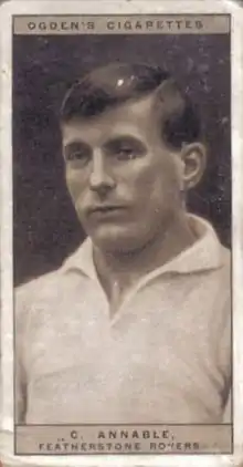 "C. Annable' Featherstone Rovers (Northern Rugby League.) "C. Annable has demonstrated to his club the value of local talent. He was born in Alverthorpe [sic] in Yorkshire, and as a youth he has time for development. He is an unorthodox worker of the scrum, for he is not merely content to get the ball but he kicks to touch to advantage, and at other times bursts round to receive a reverse pass. Though on the small side everything points to his receiving county honours."[15]
