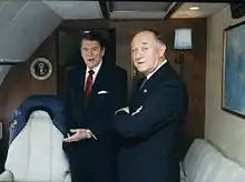 ![]() right, on Air Force One in 1988, with President Ronald Reagan, left. | |