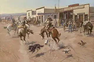 In 1913, Russell painted Wild Horse Hunters, which depicts riders capturing wild horses, each band of which is dominated by a stallion. He used as much color as an artist could on his mountain landscapes.[11] As an artist, Russell emerged at a time when the Wild West was of intense interest to people who lived in cities, and cattle drives were still being conducted over long distances. He painted images of the Old West that were later adopted by Westerns, which became a movie staple.