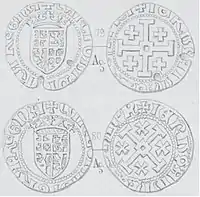 Silver gros coins of Charlotte. Issued 1458–1460, Cyprus. Obverse: Crowned shield with Lusignan coat of arms, CARLOTA DI GRA REGNA. Reverse: Cross of Jerusalem, IERVZALM E D CHIPR. Diameter 25 mm, Weight 3.96 gr (69.5 Enetian grains).[6]