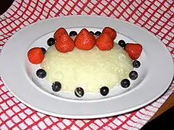 ![]() A cheese pudding garnished with strawberries and blueberries | |