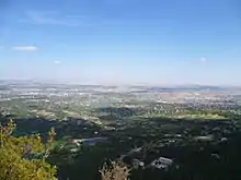 Cheyenne Mountain has three peaks. The southern peak is Cheyenne Mountain's summit at 9,200 feet (2,800 m) in elevation, the antenna farm sits on the middle peak, and the northern peak is called The Horns.[5][lower-alpha 2] Cheyenne Mountain Highway ends at The Horns.[7]: 18, 19