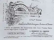 At each inauguration, large parties were held, testifying to the enormous enthusiasm and equal expectations for the work. In the article published by La Nazione on April 5, 1893, the day of the arrival in Greve, it is written that the guests gathered in Piazza della Signoria where, accompanied by the sound of the fanfare, they boarded three first-class carriages; these carriages, drawn by horses, led the guests to the tramway station located at the place called the Pratoni di Porta alla Croce (today the intersection of Viale Antonio Gramsci and Viale Giuseppe Mazzini), where they were hitched to the locomotive "Niccolò da Uzzano." The engineer of the maiden voyage was Lorenzo Boninsegni, the stoker was Attilio Bisoni, and the conductor was Egisto Chelli, over all supervised by Cavalier Lenci. The 4-kilometer section (from the Casino Bridge to the Rimaggio Bridge), which passed through a narrow gorge of the Greve River below the Vicchiomaggio Castle, caused particular astonishment during the journey. There were as many as 6,000 people in Greve waiting for the train; the town was decked out in flags and to welcome the convoy were eleven philharmonic orchestras playing the Marcia Reale in unison. On the day of the inauguration, the Greve station was not yet ready, so the train stopped at a temporary station 200 m downstream. Once disembarked, the passengers walked through the village where numerous triumphal arches were made along the way to the square. All the civil and religious authorities of the area were present in the square, among them the Honorable Sidney Sonnino.[25][26]