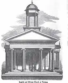 The Chinese portion of the church was dedicated on October 18, 1856. On that day Lyman Birt Peet, Justus Doolittle and Charles Hartwell of the American Board of Commissioners for Foreign Missions also attended the services. The edifice was built of brick, resting on a stone foundation. After the English portion was dedicated on December 28 of the same year, the Church of Heavenly Peace became the first Christian church erected in Fuzhou, and also the first Methodist church in China, which conducted services in English. The services on that occasion were conducted by Rev. Erastus Wentworth who delivered a discourse on 1 Kings 9:3 to the foreign audience.[2]
