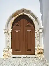 The first substantial church was probably erected in Estômbar in the first half of the 16th century (while Lagoa was still part of the municipality/concelho of Silves).[1] The style of the main door of the church and its affinity to similar buildings such as the principal churches of Alvor and of Odiáxere, and Santa Misericórdia Church of Silves suggests the existence of a regional sub-group of Manueline architecture in the Algarve.[2] The popular prevailing style of the time is reflected in this church: a tripartite nave with a wooden ceiling, no transept, and altars at the head of the nave on each side of the chancel, as well as side chapels.[2][3]