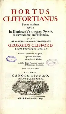 George Clifford II's only son was George Clifford (1685-1760), who is best known as the patron of the Swedish naturalist Carl Linnaeus, whom he employed as 'hortulanus' to catalog the family's unique collection of plants, herbarium, and library.[5] The result was Linnaeus' book Hortus Cliffortianus, whose publication costs were paid by George Clifford III. A large part of his botanical collection, the Clifford Herbarium, is in the Natural History Museum in London.[6]