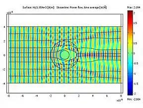 The metascreen consisted of a 66 micrometre thick polycarbonate film supporting an arrangement of 20 micrometer thick copper strips that resembled a fishing net. In the experiment, when the metascreen was hit by 3.6 GHz microwaves, it re-radiated microwaves of the same frequency that were out of phase, thus cancelling out reflections from the object being hidden.[18] The device only cancelled out the scattering of microwaves in the first order.[18] The same researchers published a paper on "plasmonic cloaking" the previous year.[19]