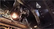 The thrill here isn't in the critter but in how it's revealed. First we see what it's capable of. Then we catch a tail here, a limb there. The spider-crabs announce their presence with authority. Then, once the opening acts are done, and Manhattan is in shambles, the big guy is ready for his close-up.[24]