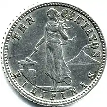 10 centavos | 17.5 mm (1903–1906) 16.5 mm (1907–1935) | 2.69 g (1903–1906) 2 g (1907–1935) | 90% Silver (1903–1906) 75% Silver (1907–1935) | Reeded | Lady Liberty striking an anvil with a hammer and Mt. Mayon | Eagle atop stars-and-stripes shield; legend "United States of America"; mint date & mintmark | yyyy | 1903 1903 S 1904 1904 S 1905 1906 1907 1907 S 1908 1908 S 1909 S 1911 S 1912 S 1913 S 1914 S 1915 S 1916 S 1917 S 1918 S 1919 S 1920 1921 1929 M 1935 M | |