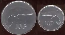 The ten pence piece featured a salmon, as the florin had previously. The redesigned smaller 10p of the 1990s is shown on the right.