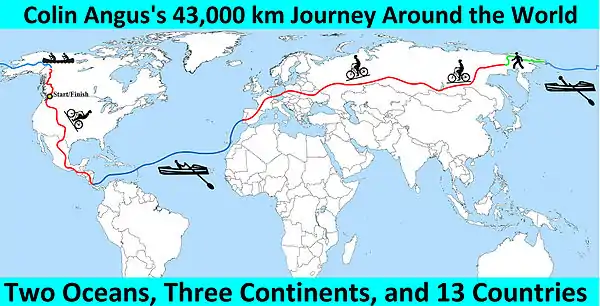 Angus traveled around the world using exclusively human power, walking and biking across land and rowing across water, completing his journey in May 2006. The expedition began with partner Tim Harvey. However, in Siberia the pair parted ways due to interpersonal conflict. Harvey continued and eventually circled the planet, but on a longer route than Angus, including Africa and South America . Angus was joined bicycling in Europe by his then fiancée Julie Wafaei, who purchased a rowboat for them to cross the Atlantic. The British adventurer Jason Lewis, claims that Angus's journey was not a circumnavigation, because it did not pass through two antipodal points on the globe, although this is not required by Guinness World Records Archived 2013-10-14 at the Wayback Machine.