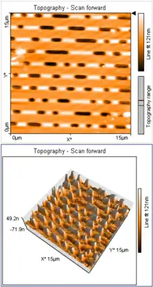 CD data is represented as tiny indentations known as pits, encoded in a spiral track molded into the top of the polycarbonate layer. The areas between pits are known as lands. Each pit is approximately 100 nm deep by 500 nm wide, and varies from 850 nm to 3.5 µm in length.[5] The distance between the tracks (the pitch) is 1.6 µm.[6][7][8]
