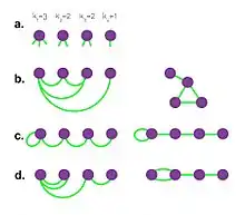 - Choose two stubs uniformly at random and connect them to form an edge. Choose another pair from the remaining stubs and connect them. Continue until you run out of stubs. The result is a network with the pre-defined degree sequence. The realization of the network changes with the order in which the stubs are chosen, they might include cycles (b), self-loops (c) or multi-links (d) (Figure 1). Yet, the expected number of self-loops and multi-links goes to zero in the N → ∞ limit.[1]