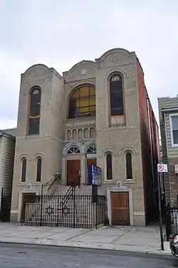 The former synagogue building was listed on the National Register of Historic Places in 2009.[1] It is a two-story rectangular structure of buff brick, with Romanesque and Classical Revival style elements. It has a tripartite front façade with round arch windows. It features the Star of David on the front fence, the stained glass windows, pews, and plaster work.[2]