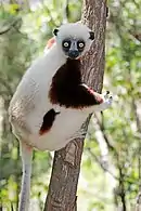 Coquerel's sifaka's herbivorous diet varies by season. In the wet season, it eats immature leaves, flowers, fruit, bark, and dead wood. In the dry season, it eats mature leaves and buds.[10] It may browse nearly 100 plant species, but the majority of its feeding time is concentrated on about 10% of these.[11] Since it has a very fibrous diet, Coquerel's sifaka has an enlarged cecum and extremely long colon that helps facilitate digestion.[12] These lemurs spend 30-40% of their day foraging, especially in the morning, midday, and evening. Females often take leadership roles during foraging and exert their dominance by eating the preferred food or denying the males food until they are satisfied. These lemurs are beneficial to the environment because they aid seed dispersion. Captive Coquerel's sifakas eat shining leaf sumac and mimosa.[13]