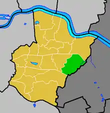 There were two main Manor Houses in the area during the Middle Ages, Newbery Manor on the site of what is now Crayford Manor House, and Howbury Manor next to Slade Green. Roger Apylton had served Kings Henry V and Henry VI as auditor, and resided at Marshalls Court, Crayford. Late in the reign of Elizabeth I Henry Partich sold Newbery Manor to Henry Apylton of Marshalls Court, and Apylton built May Place close by.[6] Hall Place, which lies alongside the River Cray, was built for Lord Mayor of the City of London Sir John Champneis in around 1537. There was also an Iron Mill, which was later replaced by a saw mill (in 1765), which produced the timber for the floor of Buckingham Palace.[5] In 1551 Francis Goldsmith bought a 'Great tenement called The Place' next to the bridge in Crayford, and between 1556 and 1586 purchased substantial amounts of local farmland and the Old Bell Public House.[7]