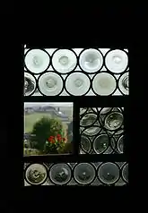 The thinnest glass was in a band at the edge of the disk, with the glass becoming thicker and more opaque toward the center. Known as a bullseye, the thicker center area around the pontil mark was used for less expensive windows. To fill large window spaces with the best glass, many small diamond shapes were cut from the edge of the disk, and then some might be halved into triangles. These were mounted in a lead lattice work and fitted into the window frame.