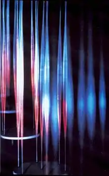 The machines and installations were a very noticeable part of the exhibition. Gordon Pask produced a collection of large mobiles (Colloquy of Mobiles (1968)) with interacting parts that let the viewers join in the conversation.[4] Many machines formed kinetic environments or displayed moving images. Bruce Lacey contributed his radio-controlled robots and a light-sensitive owl. Nam June Paik was represented by Robot K-456 and televisions with distorted images. Jean Tinguely provided two of his painting machines. Edward Ihnatowicz's biomorphic hydraulic ear (Sound Activated Mobile (SAM, 1968)) turned toward sounds and John Billingsley's Albert 1967 turned to face light. Wen-Ying Tsai presented his interactive cybernetic sculptures of vibrating stainless-steel rods, stroboscopic light, and audio feedback control. Several artists exhibited machines that drew patterns that the visitor could take away, or involved visitors in games. Cartoonist Rowland Emett designed the mechanical computer Forget-me-not, which was commissioned by Honeywell.[5]