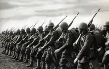 In the first months of the World War I, the response of the Czech soldiers and civilians to the war and mobilisation efforts of Austria-Hungary were highly enthusiastic as it was expected to be a short war, however it turned into apathy later.[1] In the first week after the declaration of independence the Army of the new Czechoslovak state consisted mainly of Czech and Slovak units of Austro-Hungarian Army while it also incorporated members of the Czechoslovak Legion from Italy and France.[2] that fought alongside the Entente during World War I. Czechoslovak Army took part in the brief Polish-Czechoslovak War in which Czechoslovakia annexed the Trans-Olza region from Poland. And also fought border war with Hungary for control and borders of Slovakia. The Army was modeled after the Austro-Hungarian Army with influence of the French Military Mission to Czechoslovakia. Officers were both former Austro-Hungarian and Legion officers that decided to stay in the active service. First chief of the Main Staff was French General Maurice Pellé.