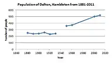 In 1881 the dominant occupation was in agriculture with 40 males in that profession. In 2011 this had changed to 32 males becoming Managers, Directors and Senior Officials in Dalton.[9] In 1881 the main profession for females was domestic services or offices, by 2011 this had changed to 16 women being Managers and Senior professionals.[10]
