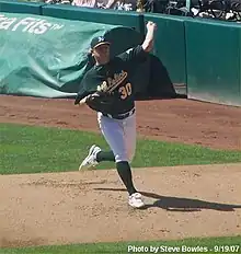 He returned to Sacramento after the game, where he picked up two more wins with a 2.25 ERA before receiving his third call-up to the majors when rosters expanded in September. He pitched 12.1 innings that September, compiling a 9.49 ERA and one loss. He returned to the A's as a reliever in 2008, and was fairly effective in his first two appearances (4 strikeouts in 5 innings, no earned runs) before making a start. He lasted five innings and gave up three earned runs, all on solo home runs, to take the loss.[10] From there, his season spiraled downward. He went 0–3 with a 10.19 ERA in eight games over the rest of the season.