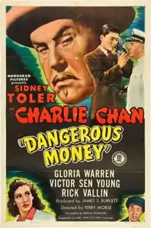 Dangerous Money, also known as Hot Money, is a 1946 American film directed by Terry O. Morse, featuring Sidney Toler as Charlie Chan.[1] This is the second and last appearance of Willie Best as Chattanooga Brown, the cousin of Charlie Chan's usual chauffeur, Birmingham Brown (Mantan Moreland).