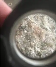 Dedham Granite is a pink to gray medium to coarse grained igneous rock.[3] It is phaneritic, meaning that the crystals are coarse enough to be seen with the naked eye. It is a two mica granite which means there are amounts of both muscovite mica and sericite present. There are also large amounts of quartz and Feldspar (mainly K-feldspar).[3] There are deposits of epidote and chlorite throughout some samples of Dedham Granite. Typically these deposits manifest as green colored veins throughout the rock.[6] Veins typically enter rocks as Hydrothermals when the minerals in the granite were crystallized from hot water or other hot liquids passing through the rock.[7] For Dedham granite alterations of K-feldspar and plagioclase feldspar allow for the formation of the epidote/chlorite vein.[3] Dedham granite typically lacks a magnetic pull meaning that it contains amounts of ilmenite and lacks magnetite.